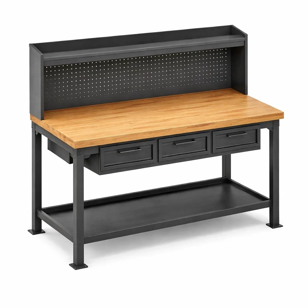 Struttura in acciaio verniciato con piano in legno massello di rovere. Include tre cassetti e una mensola inferiore per archiviazione. Dotato di pannello perforato per organizzare gli strumenti. Dimensioni: 120 cm lunghezza, 60 cm larghezza, 150 cm altezza. Peso totale: 35 kg.