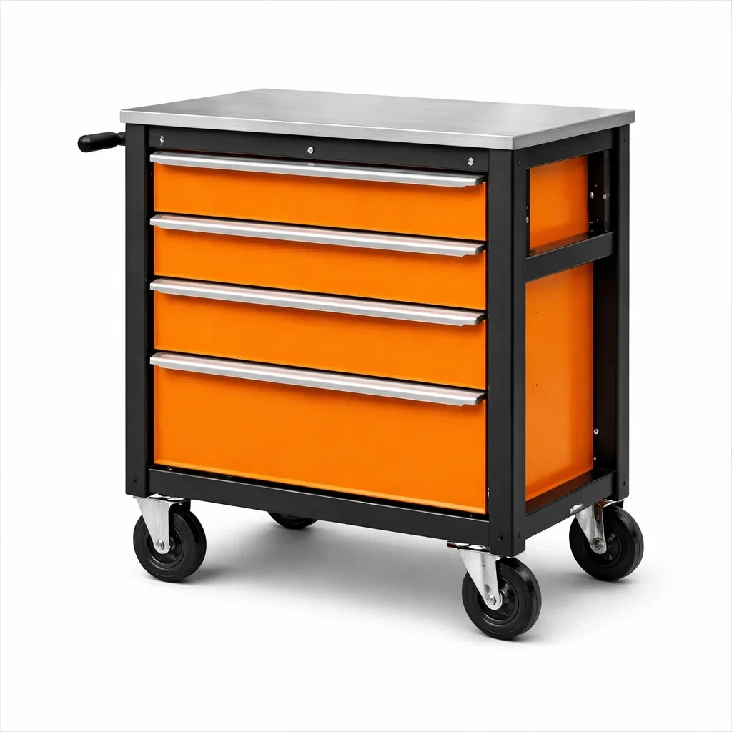 Carrello da officina con struttura in metallo e piano in acciaio. Dotato di quattro cassetti per riporre utensili e accessori, con dimensioni di 75 cm x 35 cm ciascuno. Le ruote in gomma permettono un facile spostamento. Il meccanismo di bloccaggio offre sicurezza durante l'uso. Dimensioni complessive: 80 cm x 40 cm x 90 cm. Peso totale: 35 kg. Capacità di carico massima: 100 kg.