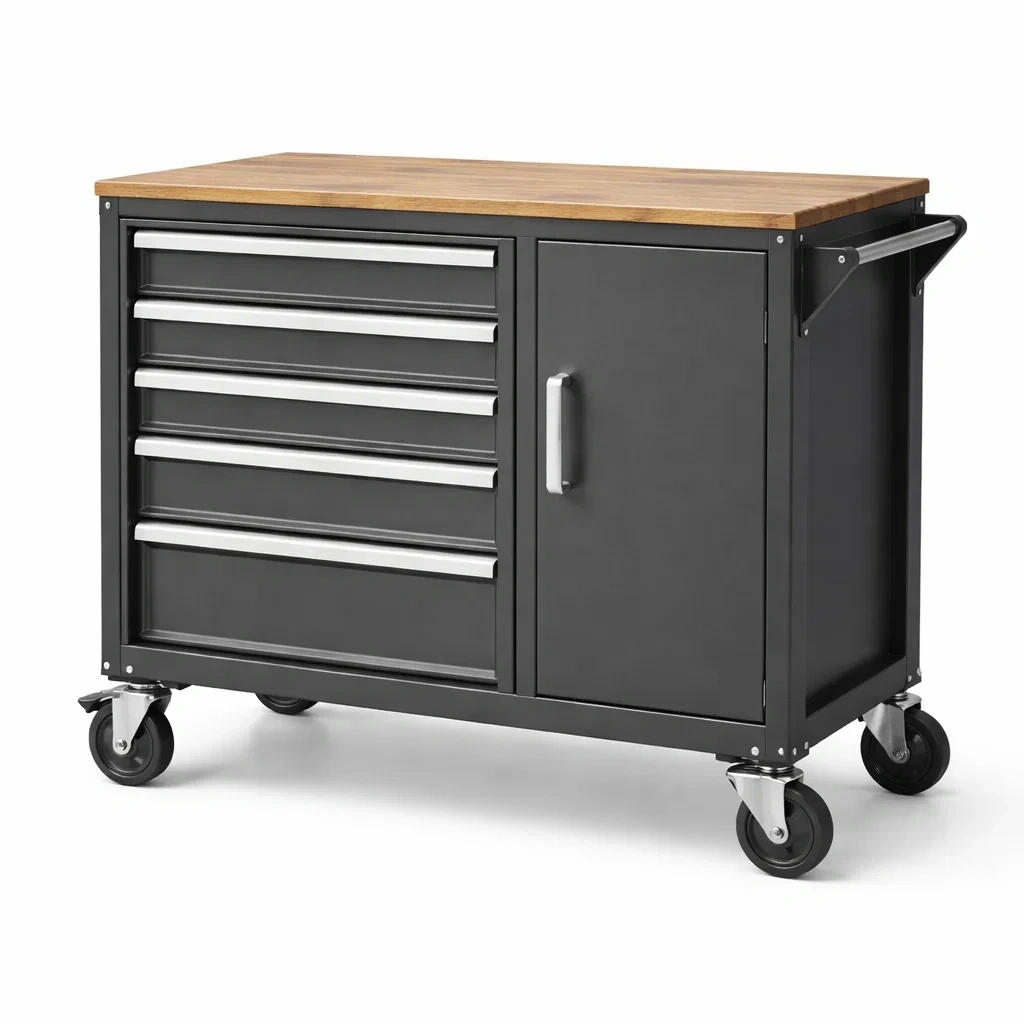 Il carrello portautensili è costruito in metallo resistente con un piano in legno di rovere. È progettato per organizzare efficacemente gli strumenti.