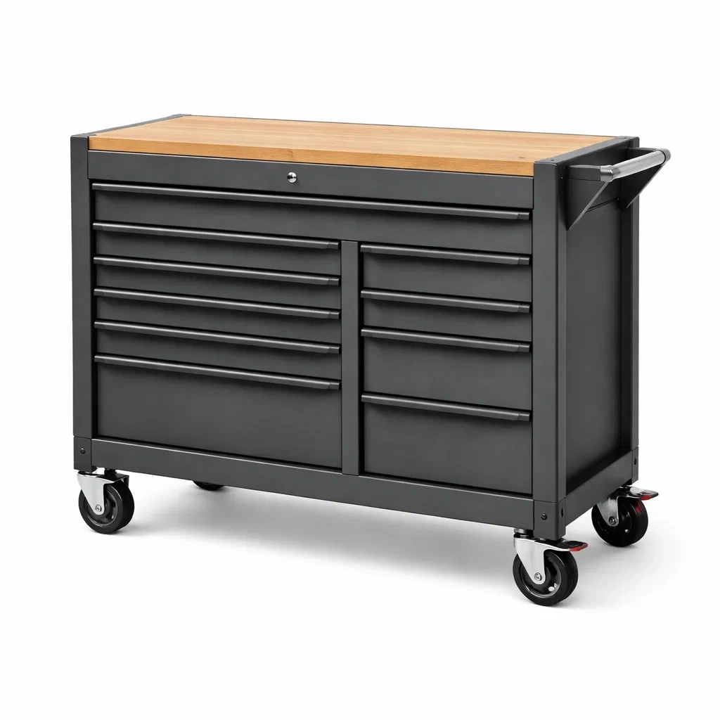 Carrello portautensili dotato di struttura in acciaio e piano superiore in legno massello. Il colore nero conferisce un aspetto professionale. Dispone di 11 cassetti con una capacità massima di 10 kg ciascuno, per un totale di 110 kg. Include ruote per una facile mobilità e un meccanismo di blocco. Trattato con rivestimento antiruggine per resistenza alla corrosione.