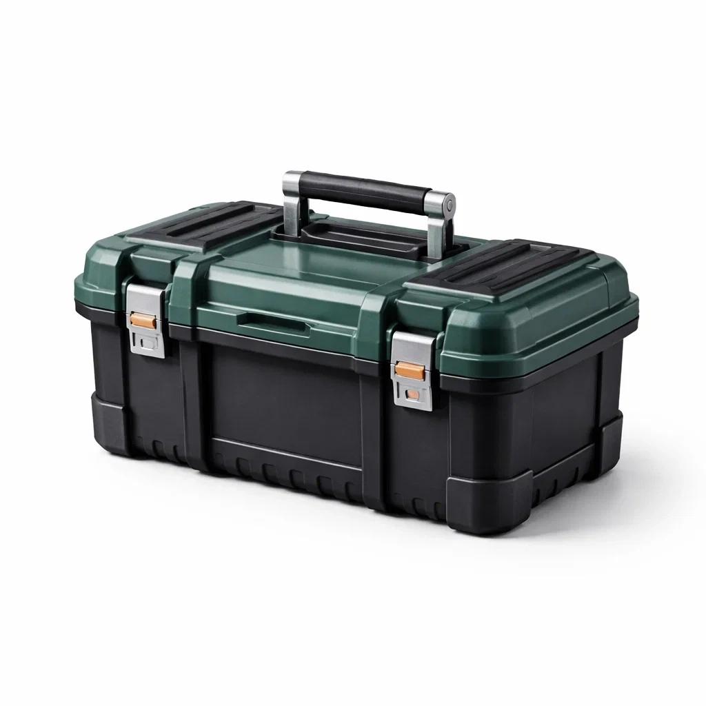La cassetta degli attrezzi è realizzata in plastica PP resistente con componenti ausiliari in metallo. Presenta una combinazione di colori verde e nero. Le dimensioni sono lunghezza 42 cm, larghezza 22 cm, e altezza 20 cm, con un peso netto di 3 kg.