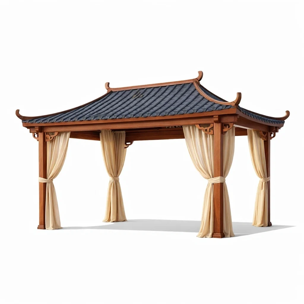 Gazebo in Legno con Tetto in Acciaio e Tende in Poliestere
