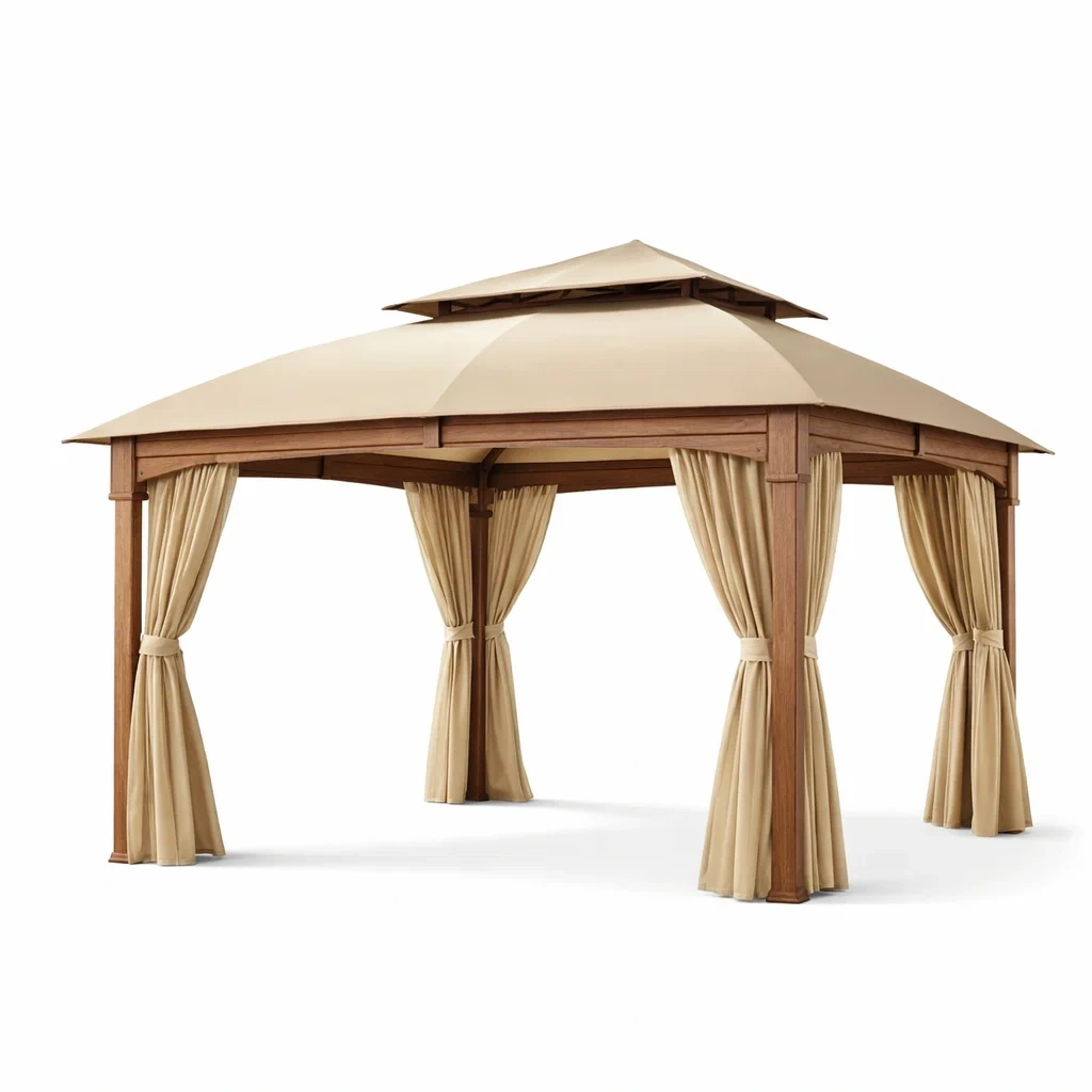 Gazebo in Legno con Tettuccio e Tende in Tessuto Poliestere Beige