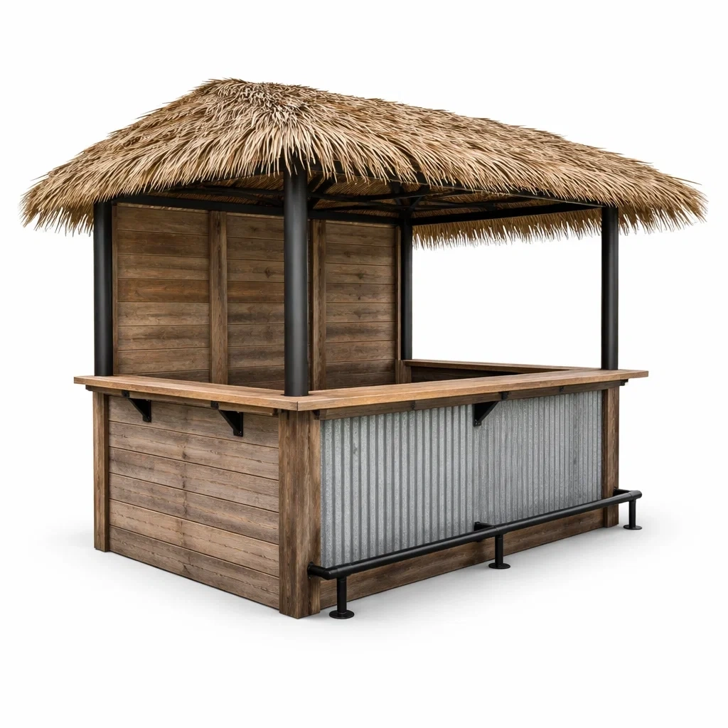 Struttura resistente in acciaio con pannelli in legno e tetto in paglia sintetica. Frontale ondulato.