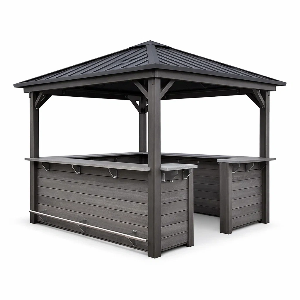 Struttura in alluminio verniciato con pannelli in legno composito. Il tetto è realizzato in metallo. Barretta poggiapiedi in acciaio INOX.