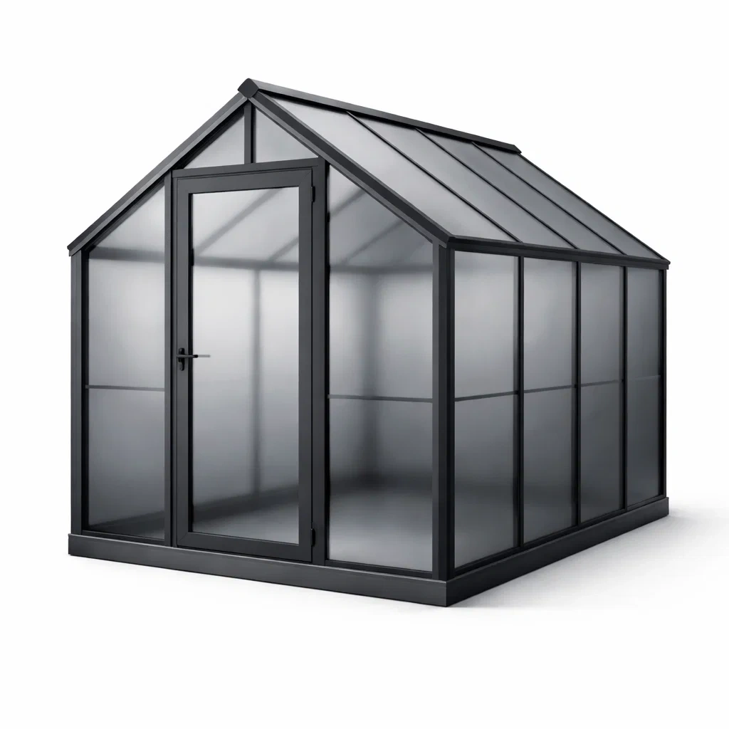 Serra da giardino con pannelli in policarbonato resistente e telaio in alluminio. Dimensioni: Lunghezza 250 cm, Larghezza 185 cm, Altezza 209 cm. Peso netto: 60 kg. Colore: Grigio.